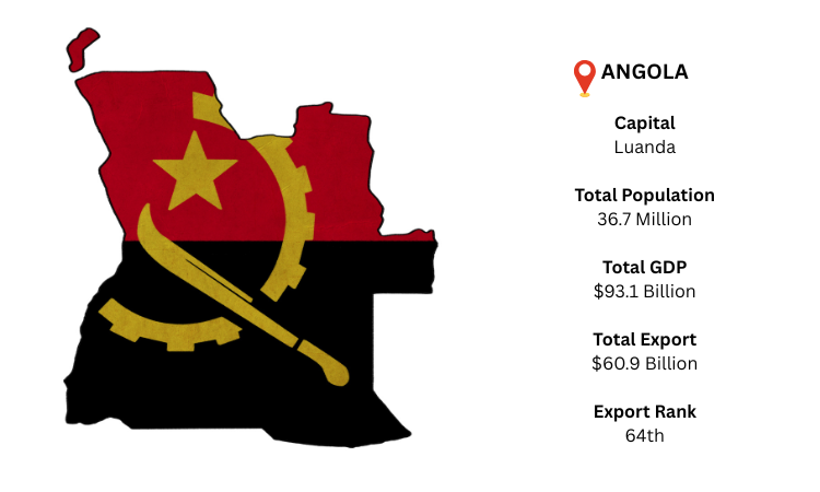 Situated on the west coast of Southern Africa, Angola is a resource-rich nation that borders Namibia, Zambia, the Democratic Republic of the Congo, and the Atlantic Ocean. Its major city and capital is Luanda. Angola's GDP is expected to reach around USD 93.1 billion by 2024. Global trade data show that Angola is the 64th largest exporter in the world. China is by far the biggest buyer of Angolan commodities. Crude petroleum, Angola's top export, is expected to account for the majority of the country's predicted USD 60.9 billion in total export value in 2024.