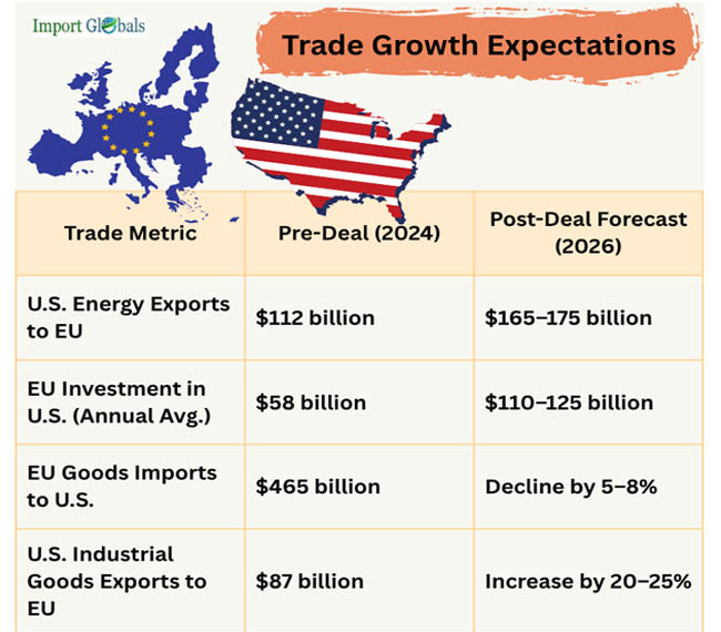 For American energy companies, the $750 billion energy component is revolutionary. In many European markets, it solidifies the United States' position as the continent's main supplier of fossil fuels and LNG, displacing Russia and the Middle East. Based on USA Export Data by Import Globals, over the following two years, U.S. energy exports by volume are also predicted to rise by 15–20% as a result of this.