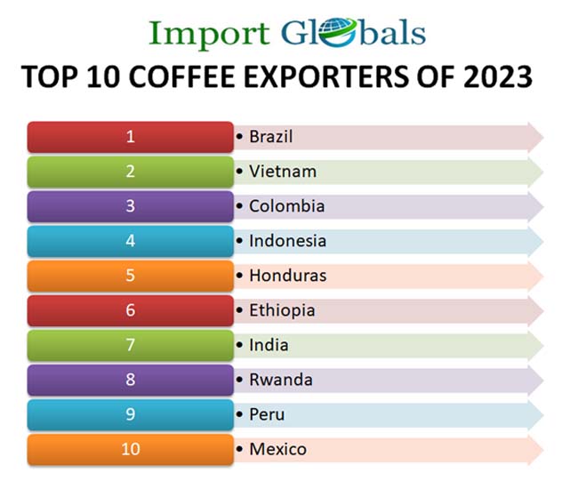 • Brazil – Total Export Trade Value of Coffee in Brazil 2023 – 6 billion US dollars; Share of coffee in Brazil export – 30%