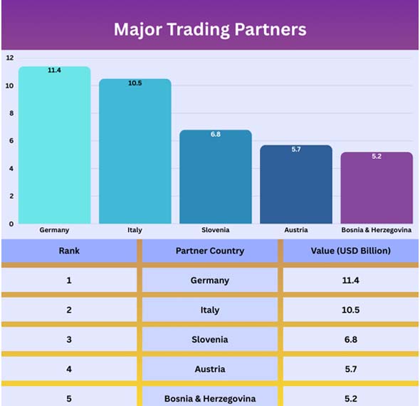 Ans. Germany and Italy are Croatia's most important allies. Slovenia, Austria, and Bosnia & Herzegovina come next.