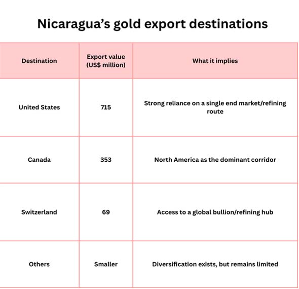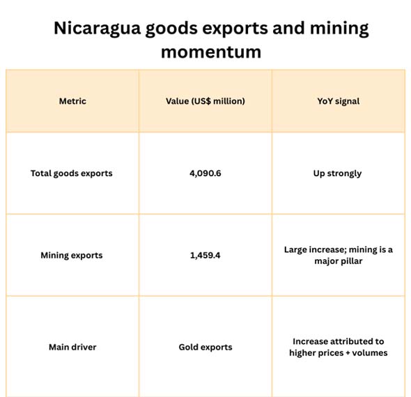 Nicaragua's official trade figures say that mining exports expanded a lot in 2025. Mining exports went up a lot in the first nine months of 2025 compared to the same time previous year. Gold was particularly named as the main factor, with both higher contract prices and larger amounts backing this up.