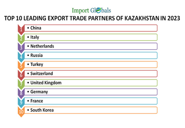 According to the Kazakhstan Trade Data, the top 10 leading export trade partners of the nation in 2023 are,