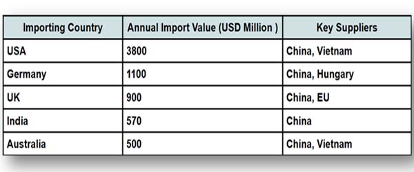 Ans. The USA, Germany, India, the UK, and Southeast Asian nations are among the top importers.