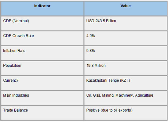 In 2023, the inflation rate was 9.8%, driven by changes in food prices and disruptions in the global supply system. Kazakhstan, which is expected to have 19.8 million people by 2024, is steadily growing its consumer base, which is raising demand for foreign goods and services. The Kazakhstani Tenge (KZT), the country's currency, is still comparatively stable while being vulnerable to outside shocks because of its trade dependence. The economy is dominated by core industries like mining, oil, gas, agriculture, and equipment, which also set the tone for both domestic and foreign trade policy. Together, these metrics show Kazakhstan's economy is expanding and has a lot of potential, even if it still depends on foreign markets for essential consumer and industrial inputs.