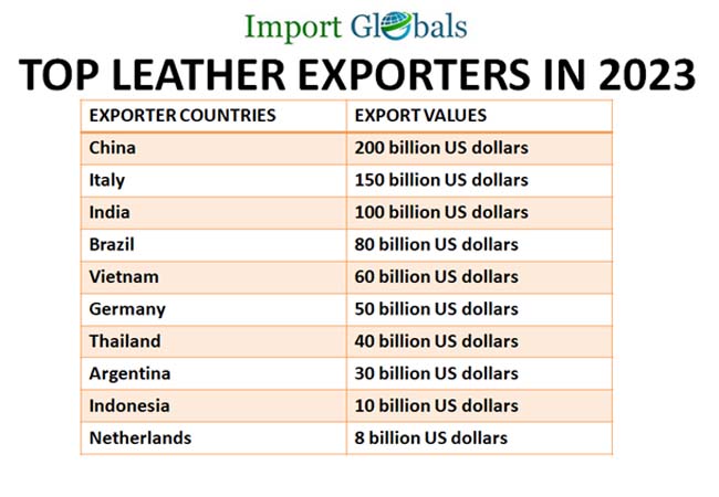 - China – As per the China Export Data, the valuation of leather exports from China in 2023 is 200 billion US dollars.