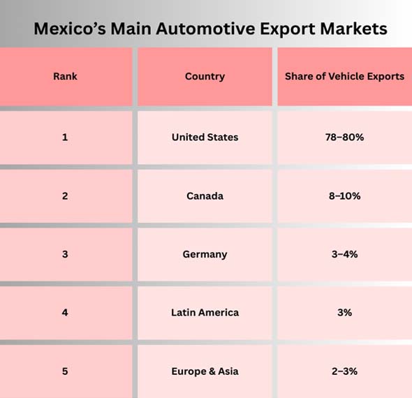 Ans. The United States is the biggest destination for Mexico's car exports, taking in between 78–80% of them.