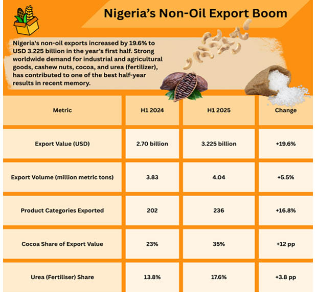 Nigeria's non-oil exports increased by 19.6% to USD 3.225 billion in the year's first half. Strong worldwide demand for industrial and agricultural goods, especially cashew nuts, cocoa, and urea (fertilizer), has contributed to the recent half-year results.