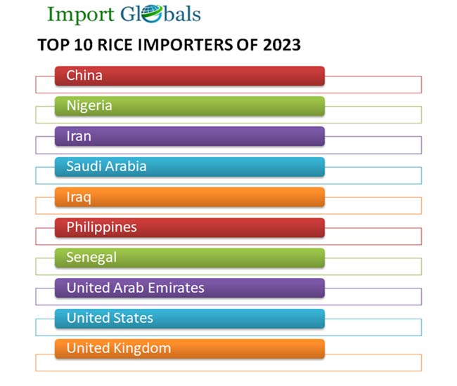 • China – Due to the limited production capabilities of rice in the agricultural sectors of China, the rapidly advancing economy is in the top position of global rice importers, with a total rice import value of 2.8 billion US dollars in 2023.