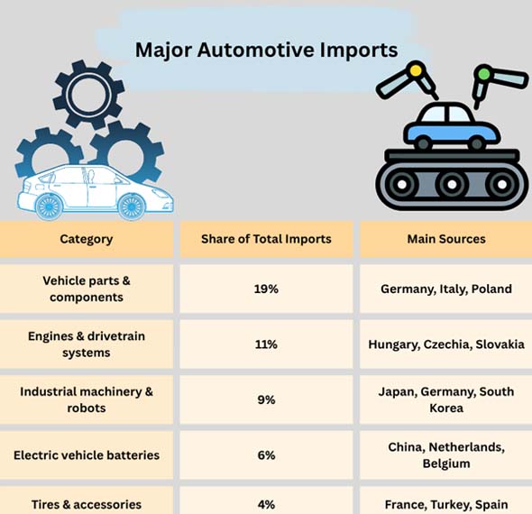 Parts for Electric Cars: As more assembly plants operate in the US, they always need batteries, sensors, and charging systems to be shipped to them. As per Romania Import Trade Analysis by Import Globals, Getting new machines from Europe and Asia is helping factories move up to Industry 4.0 norms.