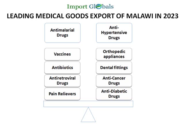 Ans. Antimalarial drugs are the top medical goods export of Malawi in 2023.