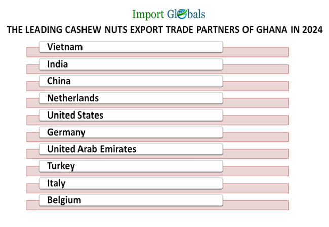 Due to the diversification in the cashew nuts demand across the globe and the increasing feasible trade of different acquisitions among the top trade leaders; Ghana has built up its trade relations with almost each of the leading destination estates. According to the Ghana Trade Data, the top 10 leading cashew nuts export trade partners of Ghana in 2024 are,