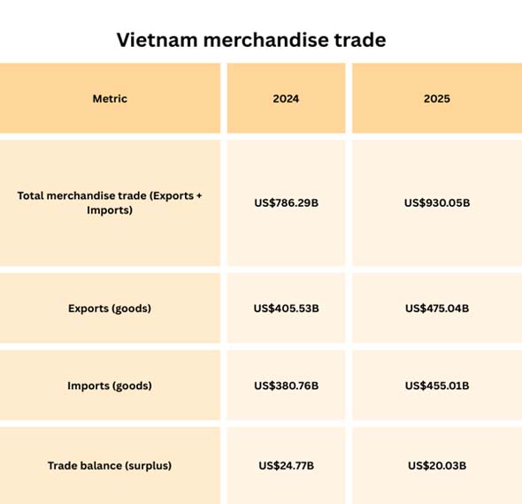 Vietnam's goods trade will reach roughly US$930 billion in 2025, which shows that the country has a mature export engine that is fueled by electronics scale, deeper global integration, and better manufacturing skills. The message for businesses all over the world is clear: Vietnam is a key part of the supply chain, and planning for 2026 should reflect that.