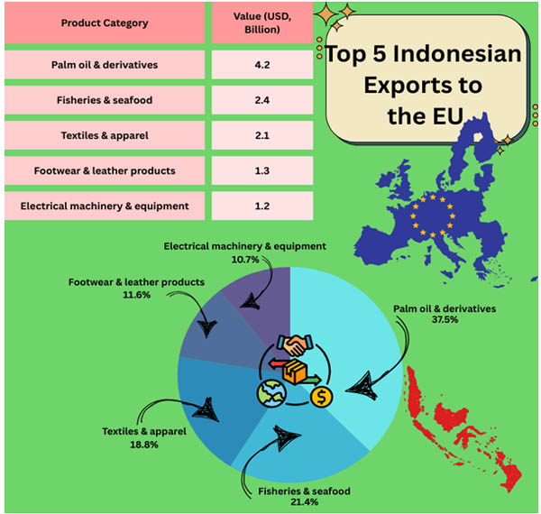 The most intriguing component is that tariffs will be lifted on roughly 80% of Indonesian exports to the EU (by tariff lines). This includes palm oil, seafood, textiles, and certain processed goods. According to Europe Export Data by Import Globals, from the European Commission and Indonesia, the CEPA is a package that combines market access, investment protection, and a big framework for sustainable trade that aims to safeguard the environment, control deforestation, and raise labor standards. Official statements also say that commerce between the EU and Indonesia, which is estimated to be about US$30.1 billion in 2024, will expand a lot. Some estimates say that it will almost double within five years of the deal going into effect.