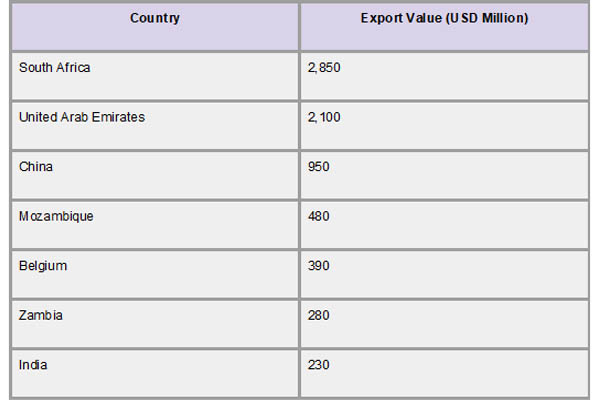 Three major trading partners, China, South Africa, and the United Arab Emirates (UAE), dominated Zimbabwe's export market in 2024. At over 36.7% of Zimbabwe's total exports, which are valued at about US$2.7 billion, the UAE emerged as the top export destination. As per Zimbabwe Import Trade Statistics by Import Globals, this notable expansion demonstrates how Zimbabwe and the UAE's economic relations are growing, especially in the trading of agricultural and mineral goods. South Africa, which received roughly 28.9% of Zimbabwe's exports, or US$2.15 billion, continued to be an important regional partner. China's 18.3% export contribution, or US$1.36 billion, was fueled by its demand for Zimbabwean resources, particularly nickel and chrome.