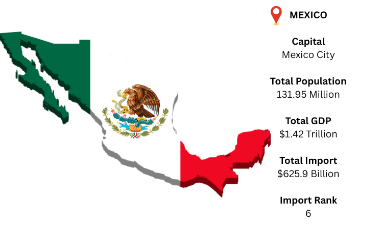 Mexico is a country in North America that borders Guatemala and Belize to the south and the United States to the north. Mexico City serves as the capital. As per Mexico import data, with a GDP of over USD 1.42 trillion in 2024, Mexico ranked as the world's fifteenth biggest economy. With the largest recorded import volume of USD 625.9 billion in 2024, the nation came in sixth place globally. Mexico's largest importer, the United States, provides commodities worth over USD 255 billion. Electrical and electronic equipment is the product category that Mexico imports the most of, making up over 21% of all imports.