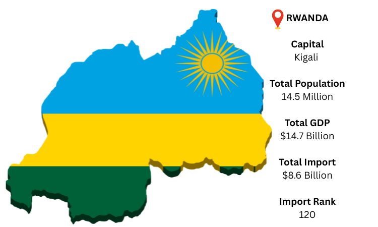 The Democratic Republic of the Congo, Tanzania, Burundi, and Uganda enclose the landlocked nation of Rwanda in East Africa. Kigali is its major city and capital. Rwanda's GDP was at USD 14.77 billion in 2024. Total imports in Q3 2024 were USD 2.144 billion, according to the National Statistics Institute; extrapolating quarterly patterns, as per Rwanda import data, Rwanda imported around USD 8.6 billion in 2024. In terms of import volume, Rwanda is ranked between 120th and 125th in the world. The main provider is China, which is followed by Tanzania, Kenya, India, and the United Arab Emirates.