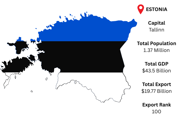 Estonia is a technologically sophisticated Baltic nation that exports equipment, timber products, and high-value tech items. The capital, Tallinn, directs its export policy. As per Estonia export data, Finland, Latvia, and Sweden were the major export destinations for Estonia, which has a population of roughly 1.37 million and a GDP of about USD 43.5 billion. Estonia's total exports reached USD 19.77 billion. Its top exports, which include equipment, wood products, and electronics, demonstrate a robust and varied product line.