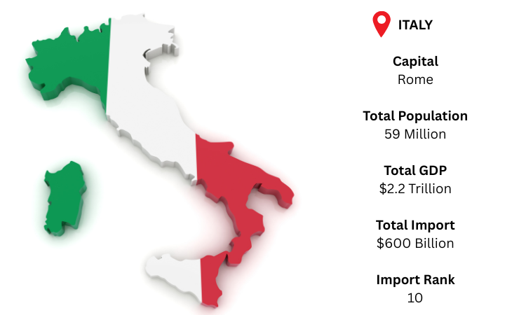 One of Europe's greatest importers of energy, raw materials, and high-tech components is Italy, the third-largest economy in the Eurozone. Imports are crucial to the manufacture of its industrial heartlands, particularly in the chemical, automotive, and equipment industries. The capital is Rome, and the nation's commercial position is reinforced by its strategically located Mediterranean ports. As per Italy import data, Italy, which has a population of over 59 million and a GDP of almost USD 2.2 trillion, is expected to import approximately USD 600 billion in 2024, highlighting its pivotal position in European commerce.
