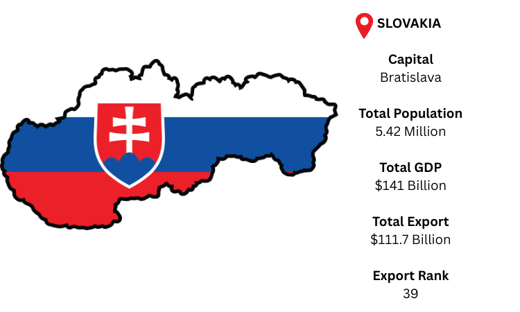 Slovakia exports expensive automobiles, electronics, and machinery, and is the top car manufacturer in Central Europe per capita. The capital is Bratislava. According to Slovakia export data, with a GDP of USD 141 billion and a population of 5.42 million, its industrial prominence was further reinforced when its total exports hit USD 111.7 billion.