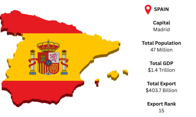 Spain has a strong industrial base and is a significant exporter worldwide. According to Spain export data, with a population of around 49.2 million and a GDP of USD 1.8 trillion, Spain's capital, Madrid, had exports of USD 403.7 billion, while imports of USD 451.3 billion created a trade imbalance.