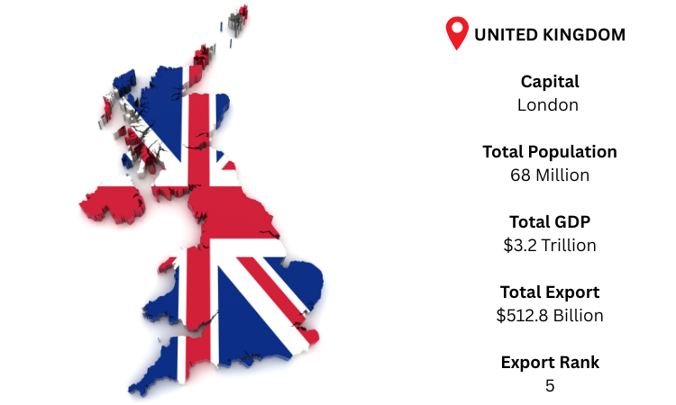 The UK continues to have an internationally diversified export economy that includes energy, precious metals, automobiles, and equipment. As per United Kingdom export data, with a population of over 68 million and a GDP of about USD 3.2 trillion, London serves as the capital. Total exports came to USD 512.8 billion, while imports exceeded exports, resulting in a significant trade imbalance.